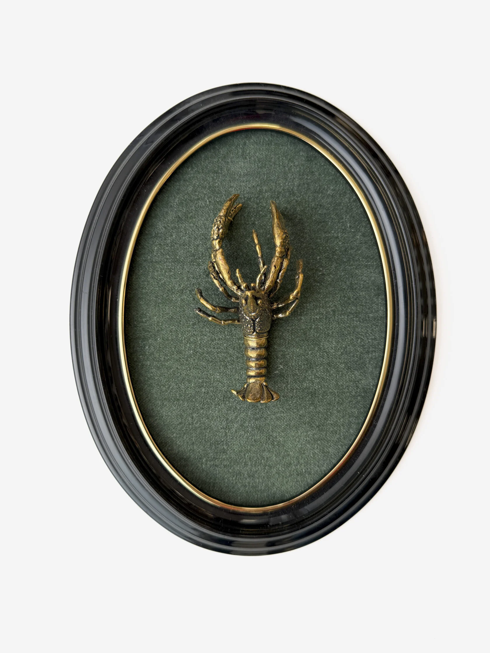 A one-of-a-kind wall piece featuring a vintage brass crab resting on deep green velvet, framed in a rescued and repainted black frame. Each frame is sourced second-hand, carefully restored and given a new life — which means every artifact is truly unique.