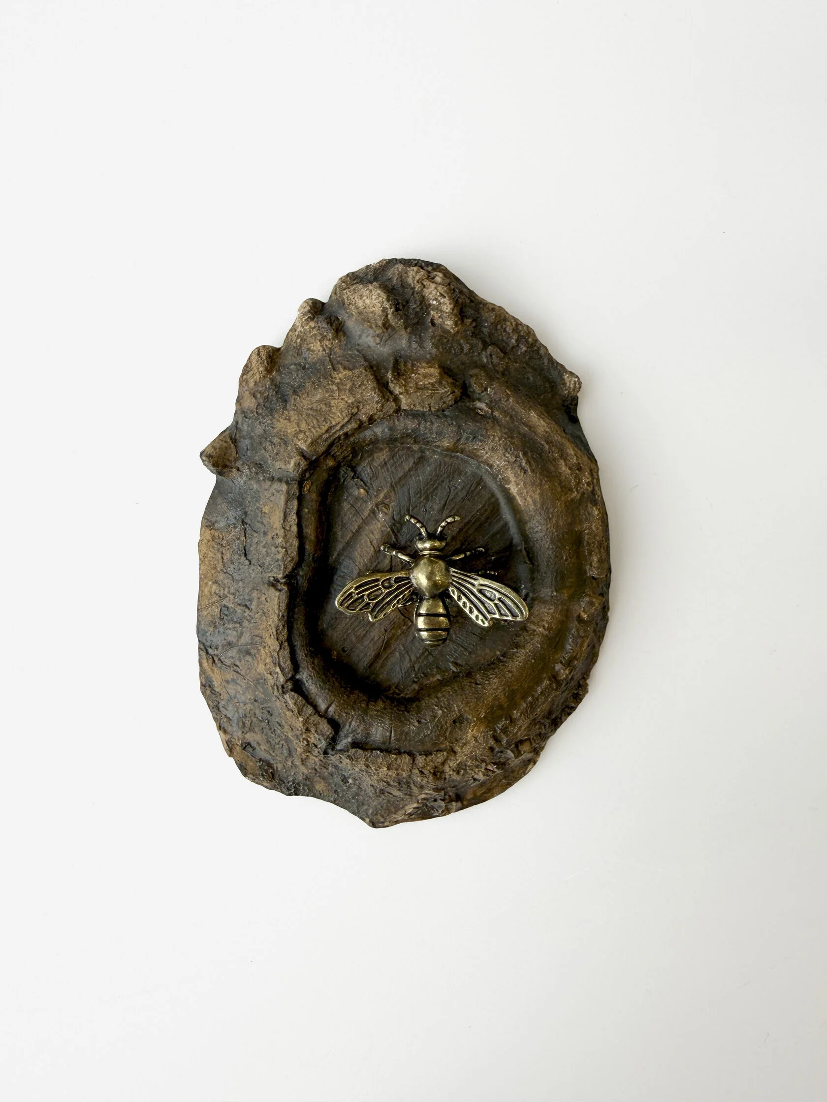 Bee perched on a textured plaster base cast from real wood. A delicate emblem of labor, order, and ritual. Approx. 15ร12 cm.